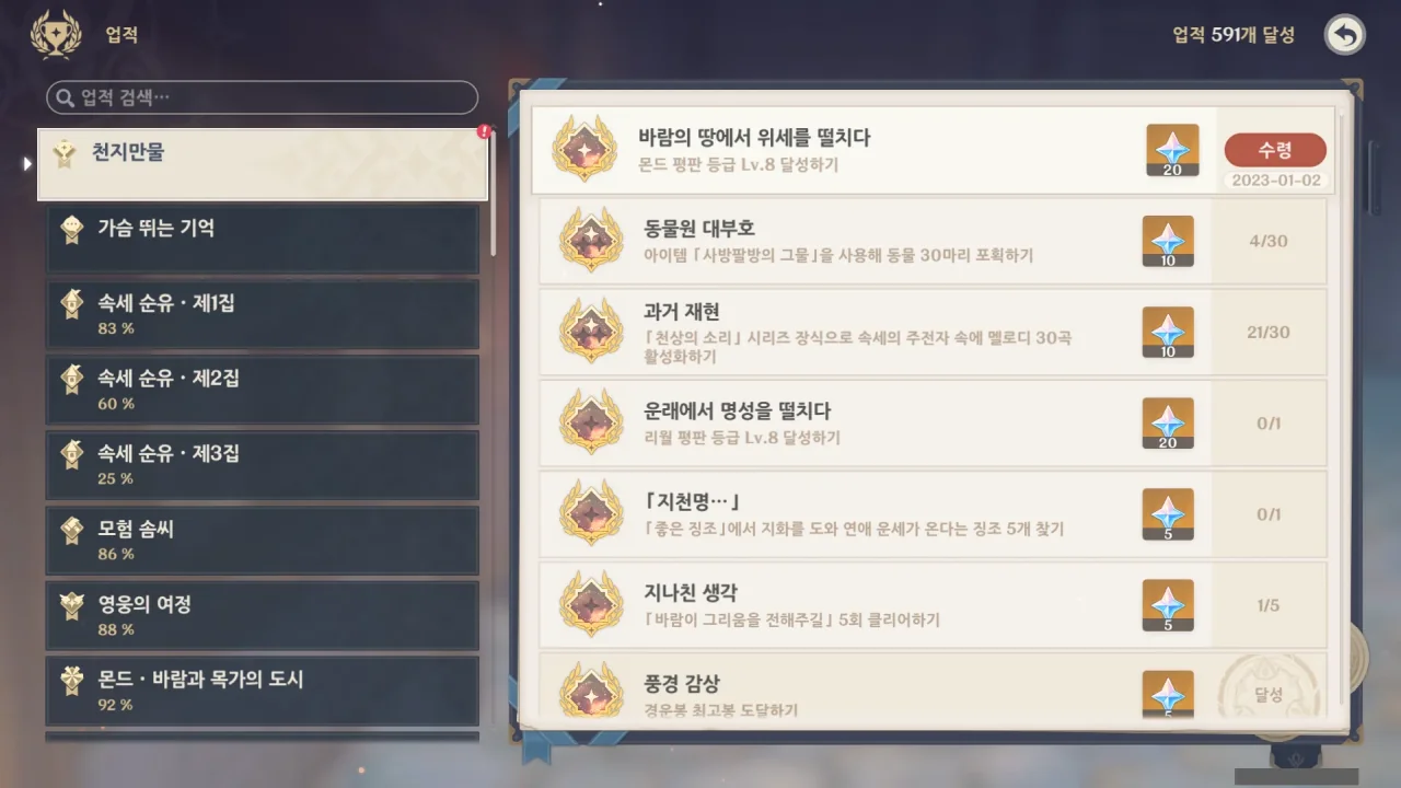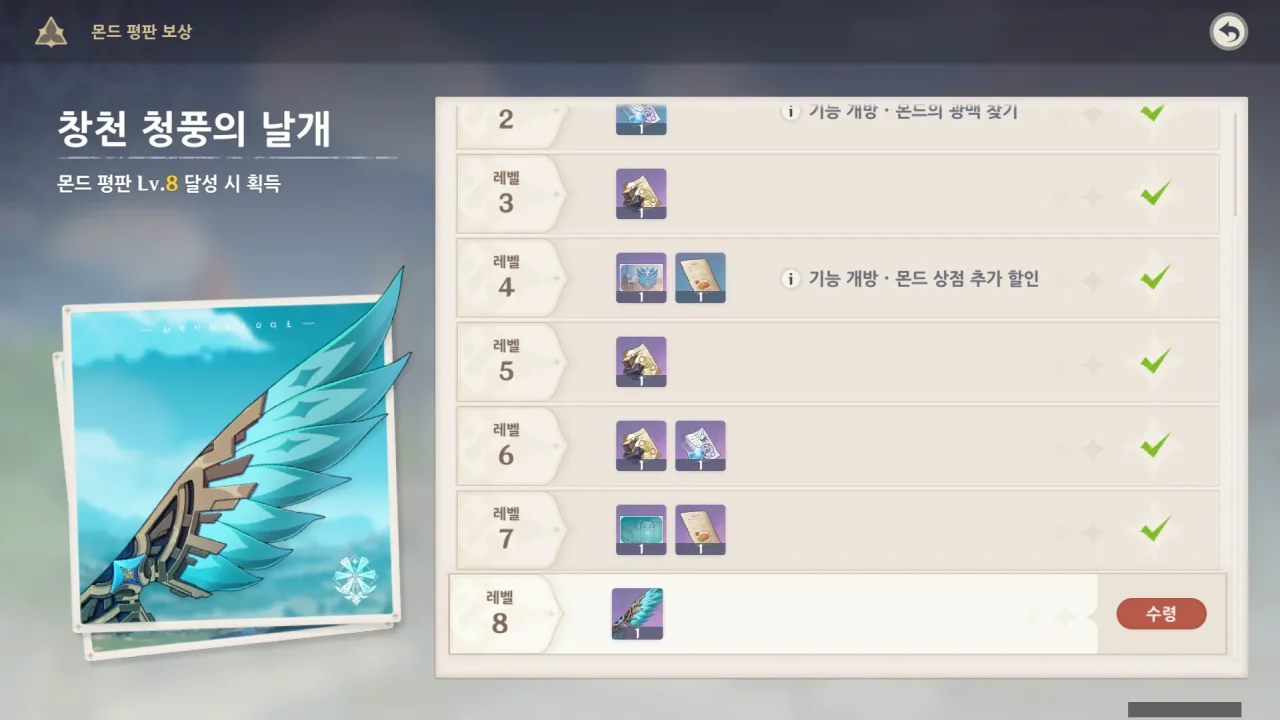 드디어 몬드도 평판 만렙을 찍었다. 지금 수메르, 몬드 이렇게 두 지역만 평판이 만렙이니까… 얼른 리월하고 이나즈마 평판도 만렙을 찍어서 이쁜 날개들을 얻어야겠다.
