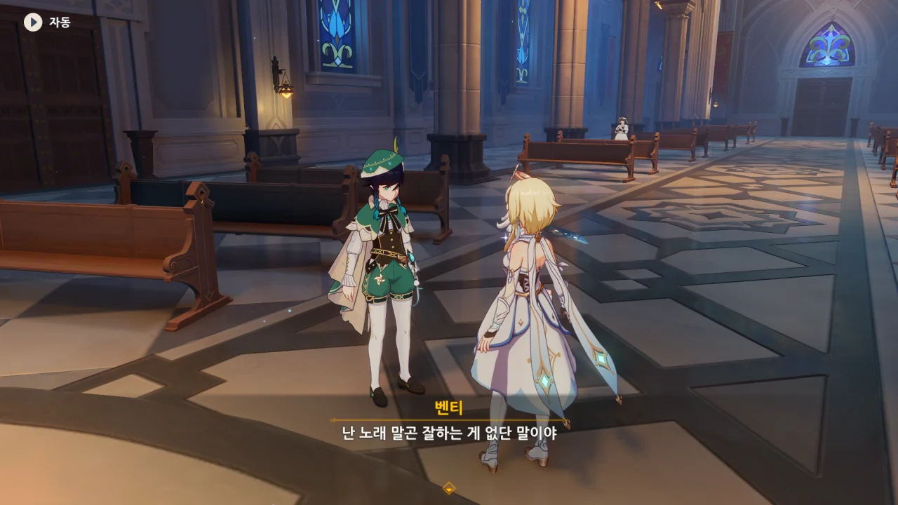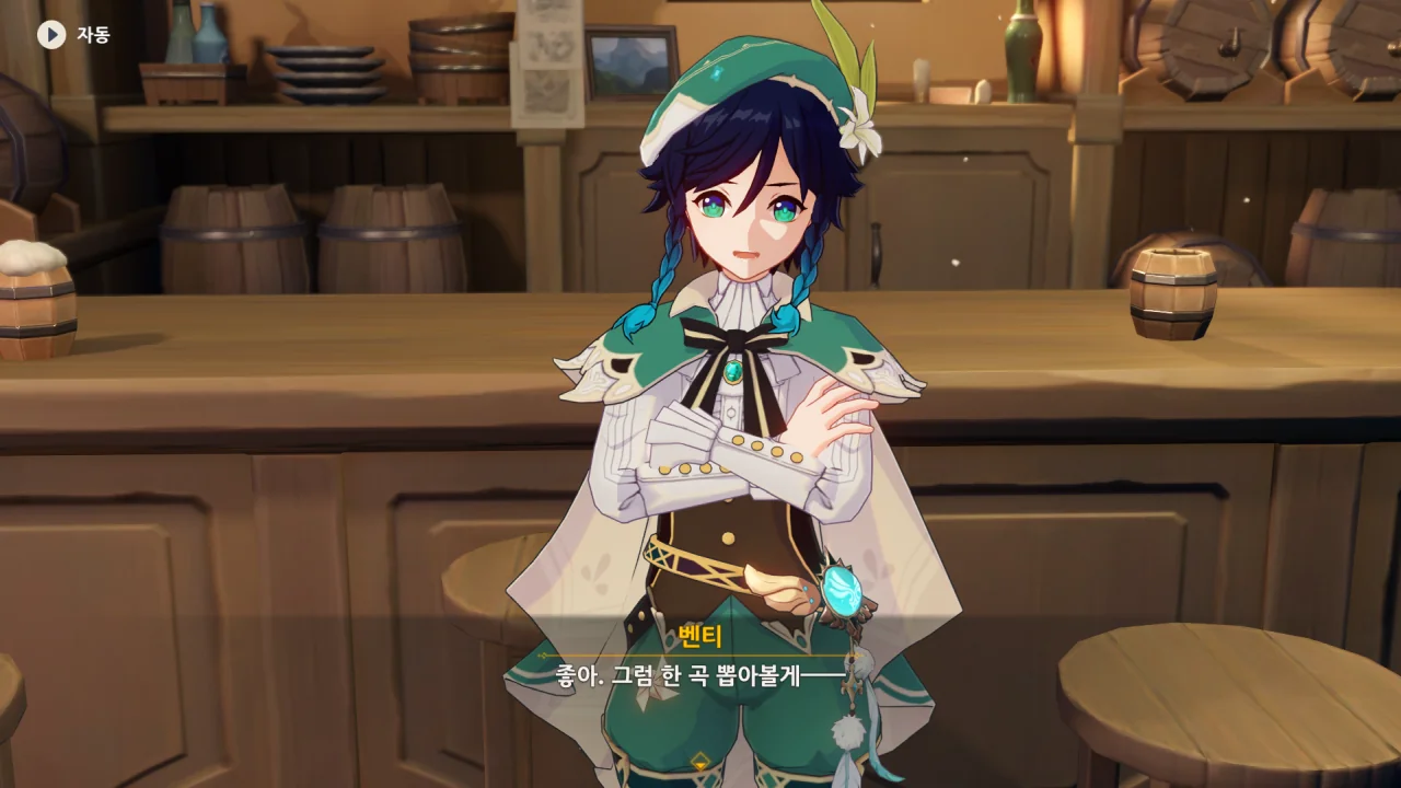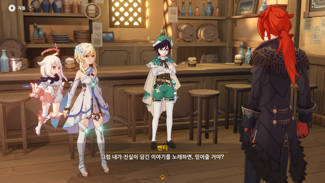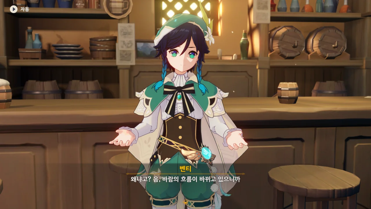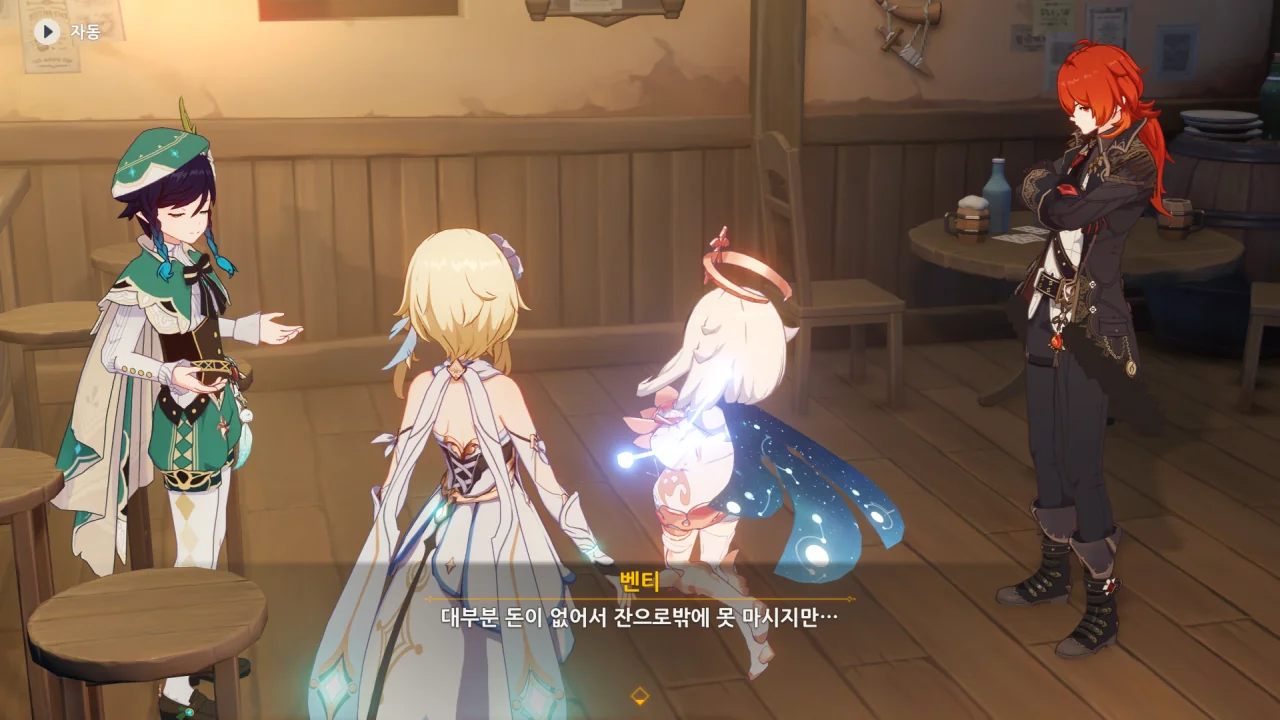 대화로 안 되니 곧바로 훔칠 생각을 하는 벤티. 심지어 자기는 노래 말고 잘하는 게 없다며 여행자더러 천공의 하프를 훔치라고 한다.