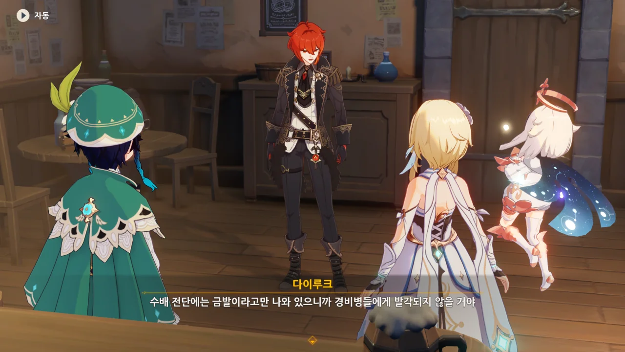 여행자에 대해선 수배 전단에 그저 '금발'이라고만 나와 있어 행동이 자유롭지만, 벤티는 워낙 눈에 튀는 옷차림이라 일이 어느 정도 풀리기 전까진 계속 천사의 몫에 갇혀 있어야만 한다.