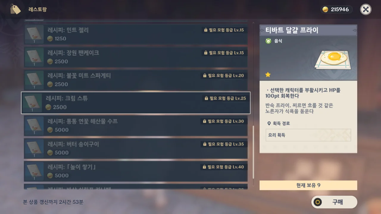 「디어 헌터」에서 요리 레시피를 사려했으나, 모험 등급이 20이나 되어야 요리 레시피를 살 수 있다.