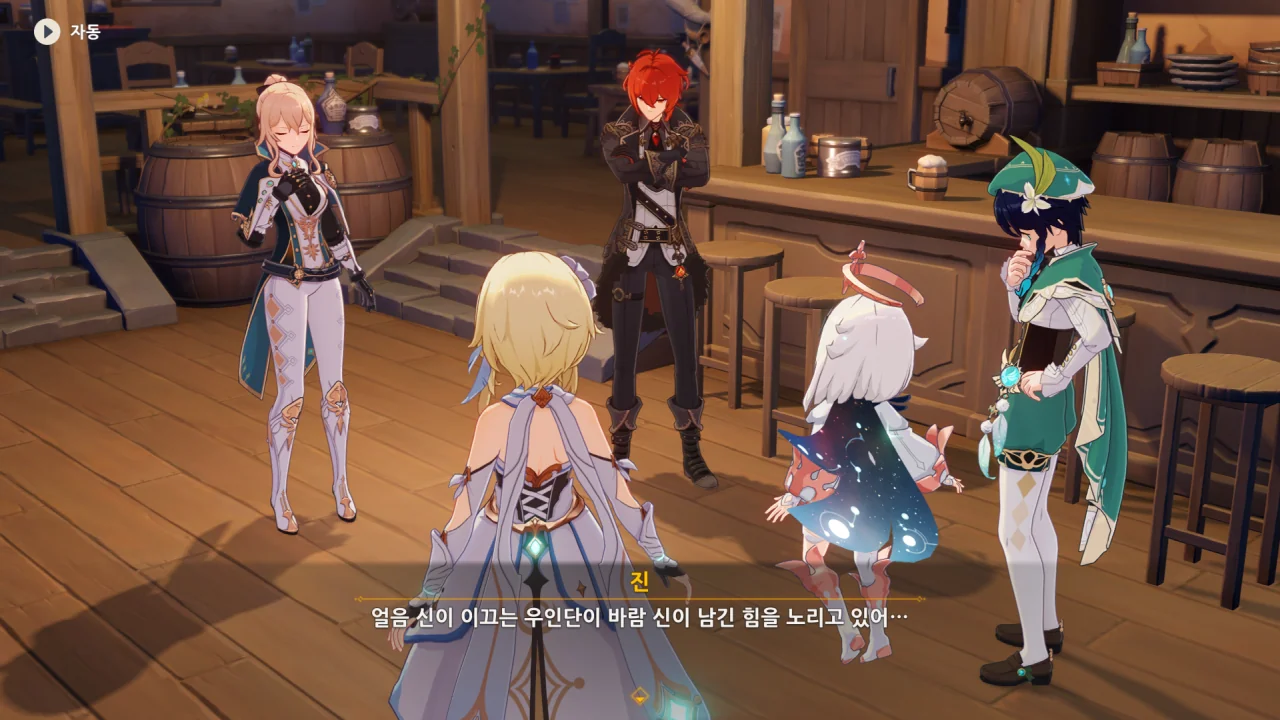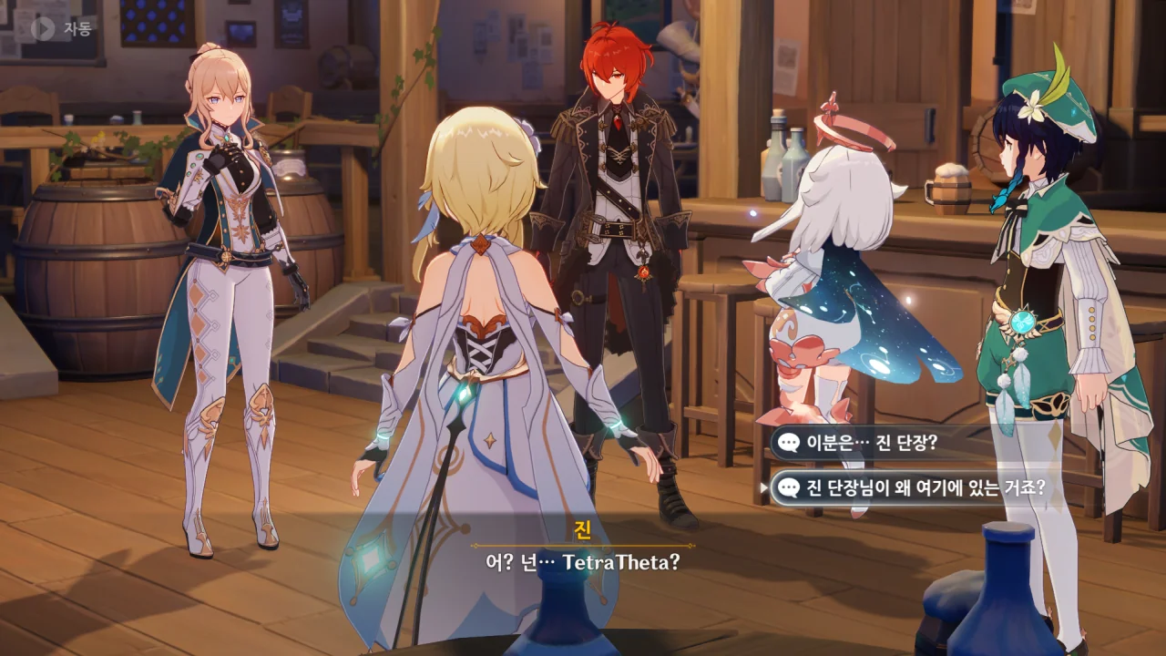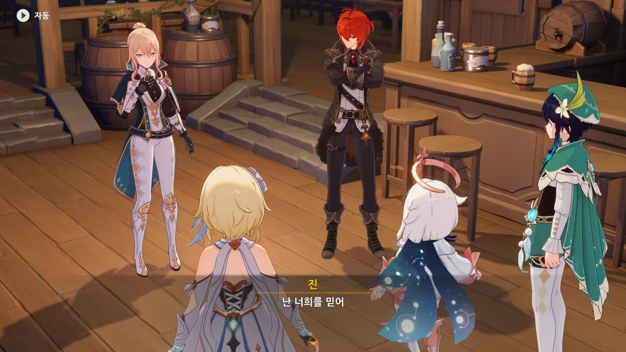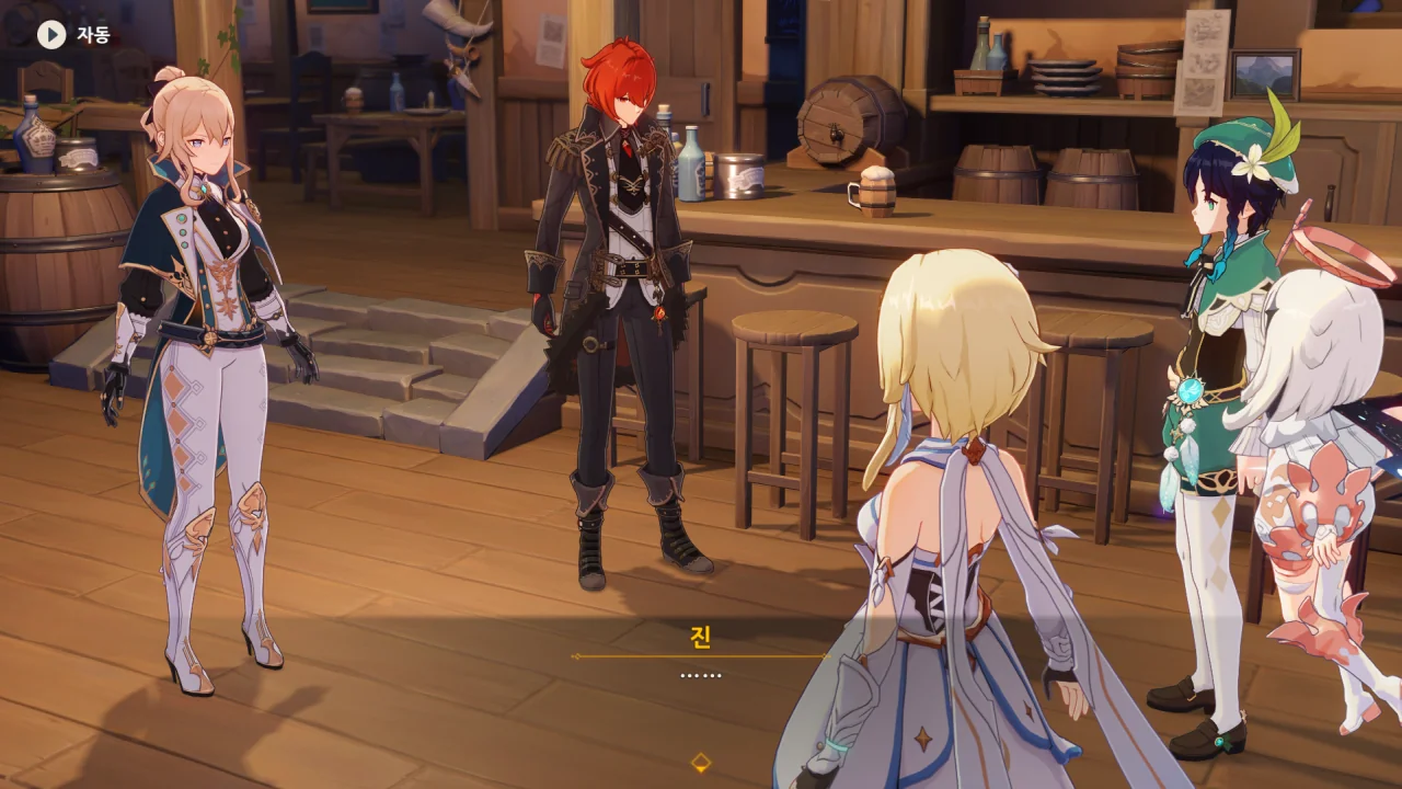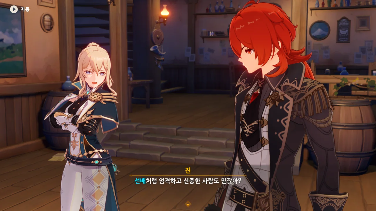 진이 여행자와 벤티의 말을 단번에 믿어버리자, 말하다 말고 "… 응?"이라고 되묻는다.
