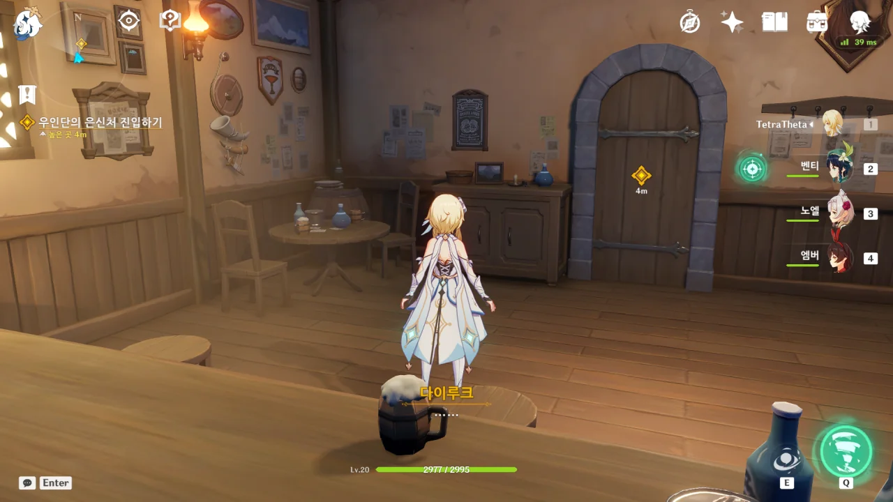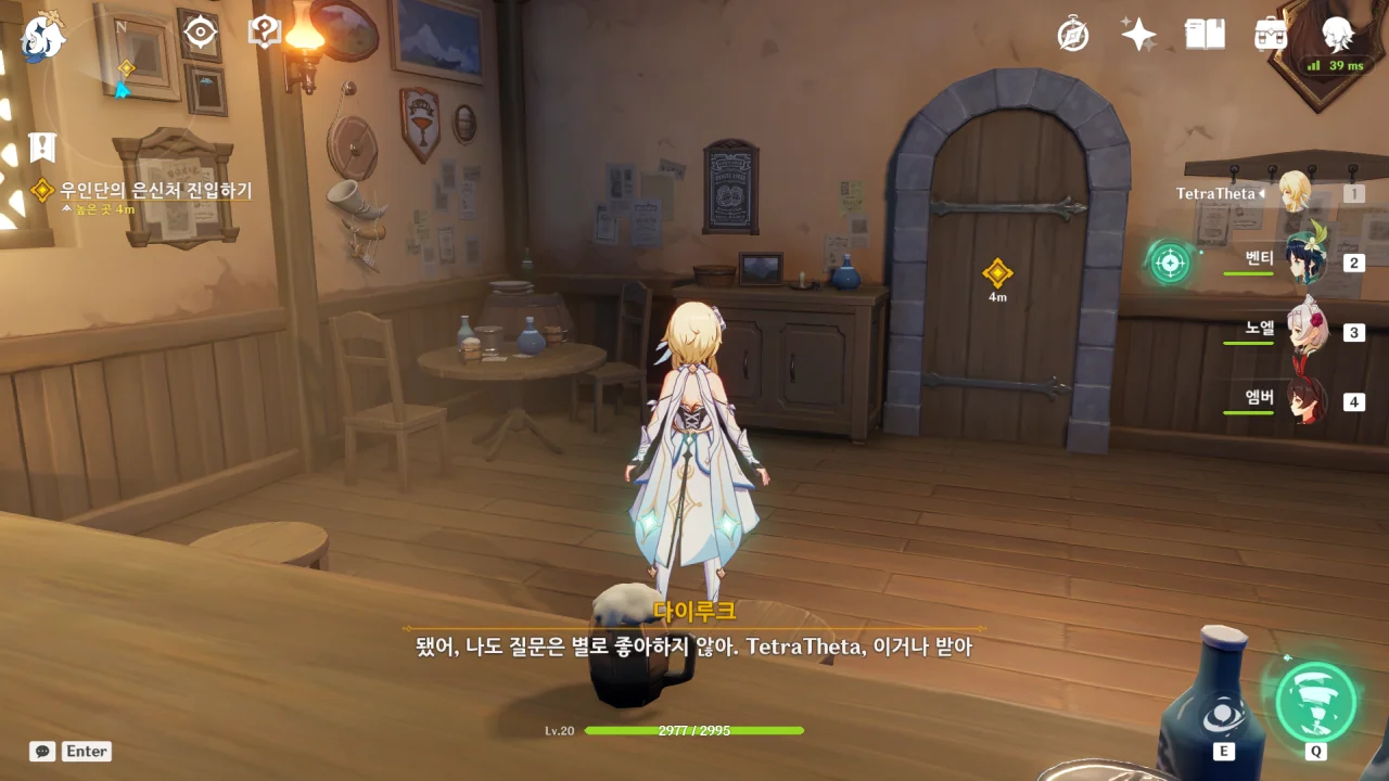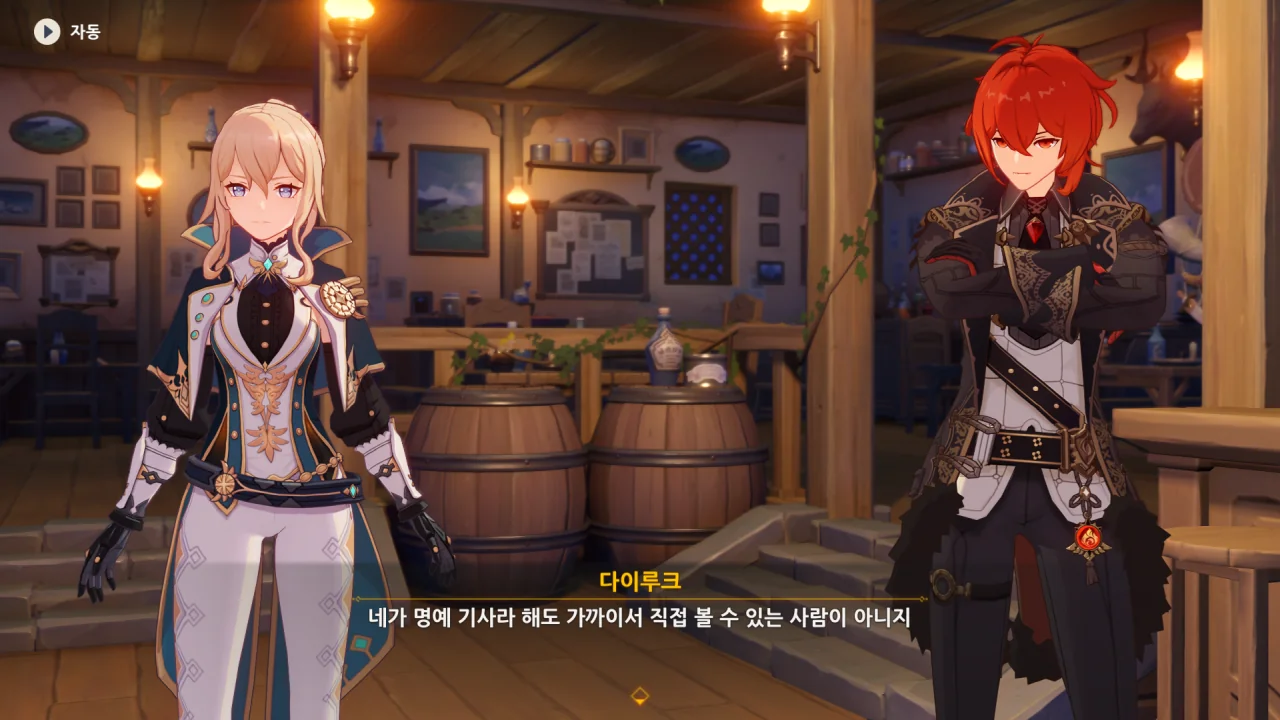 아까 다이루크가 진에 관해 이야기할 때, "네가 명예 기사라 해도 가까이서 직접 볼 수 있는 사람이 아니다"라고 한 것을 생각해 볼 때, 다이루크는 진과 여행자가 이미 면식이 있는 사이인 걸 전혀 몰랐던 모양이다.