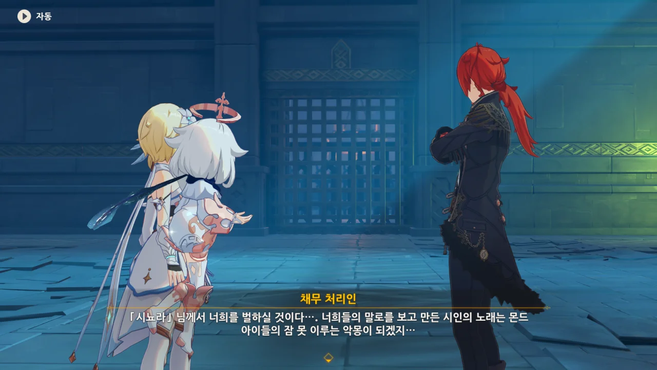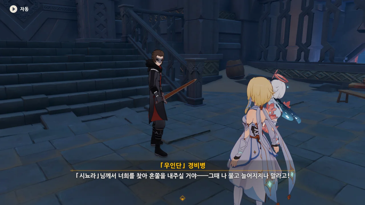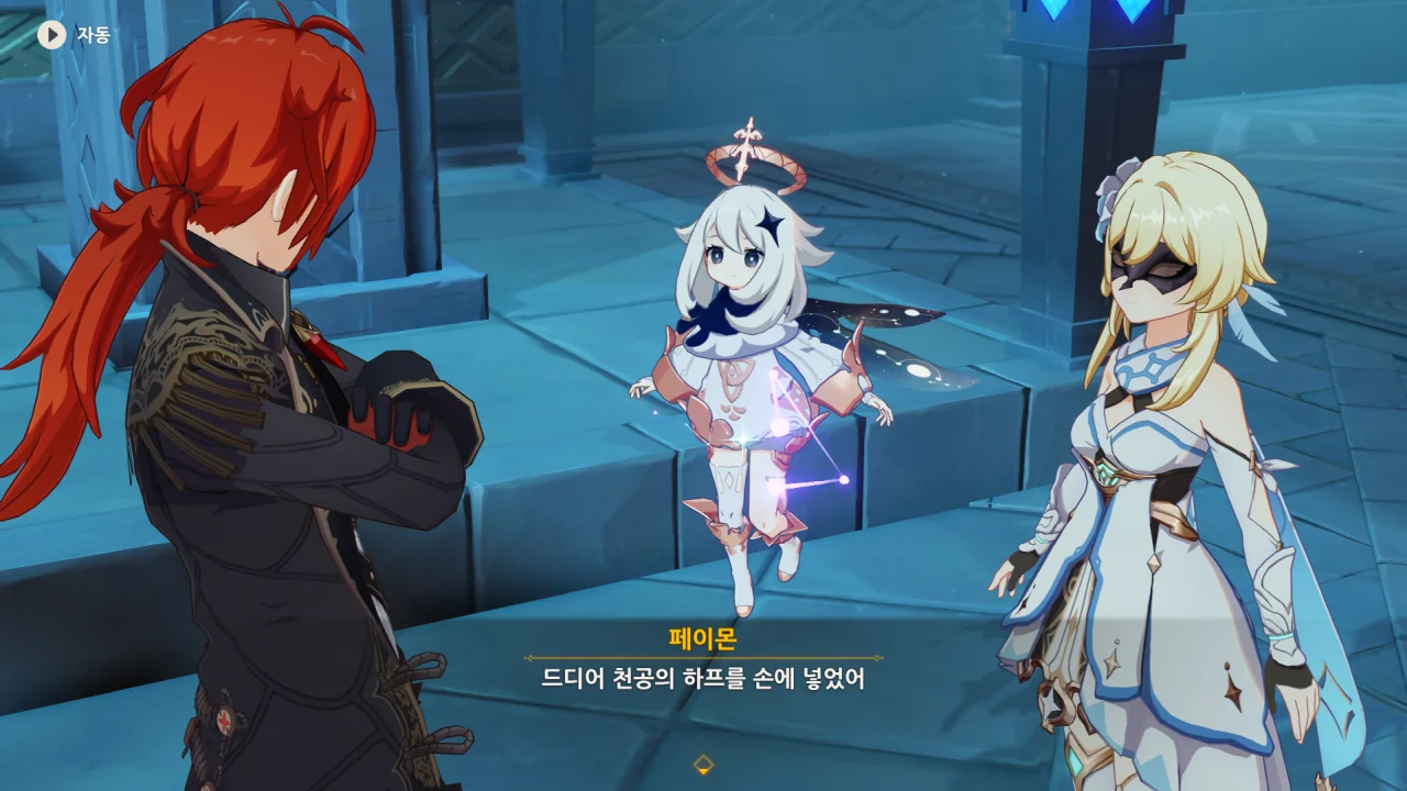 여행자와 다이루크가 가면을 쓰고 있다. 다른 캐릭터들 역시 가면을 쓰고 있나 확인해 봤는데, 여행자와 다이루크만 가면을 쓰고 있더라.