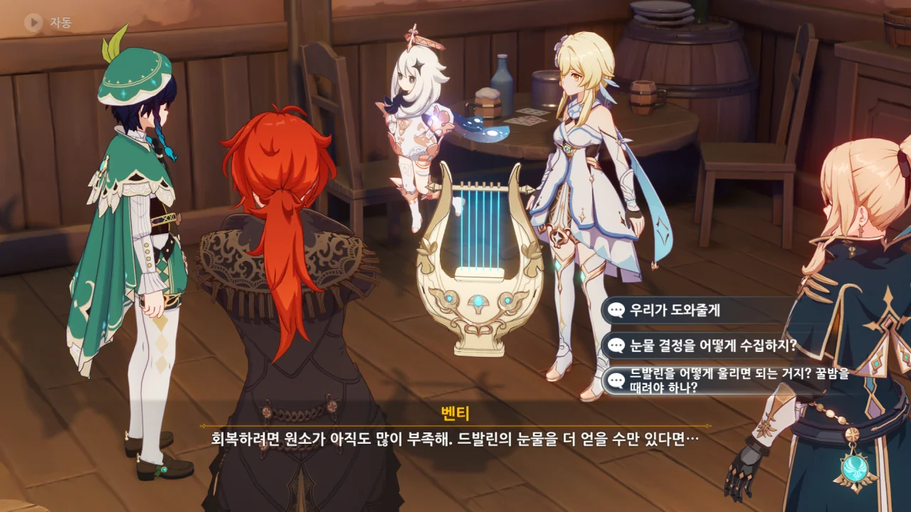 정화된 드발린의 눈물 결정을 하프 위에 조금씩 떨어트려 보라고 한다.