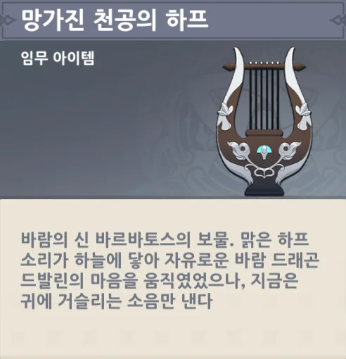 컷신에서도 봤듯이, 천공의 하프는 이미 망가질 대로 망가져, 더 이상 악기 노릇을 할 수 없게 되었다.