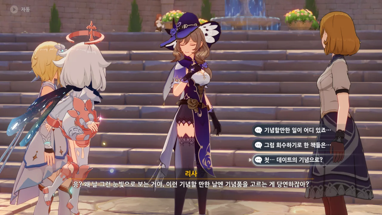 능청스럽게 "이런 기념할 만한 날에는 기념품을 고르는 게 당연하다"고 하는 리사를 곯려줄 목적으로 "첫… 데이터의 기념으로?"라는 선택지를 골랐다.
