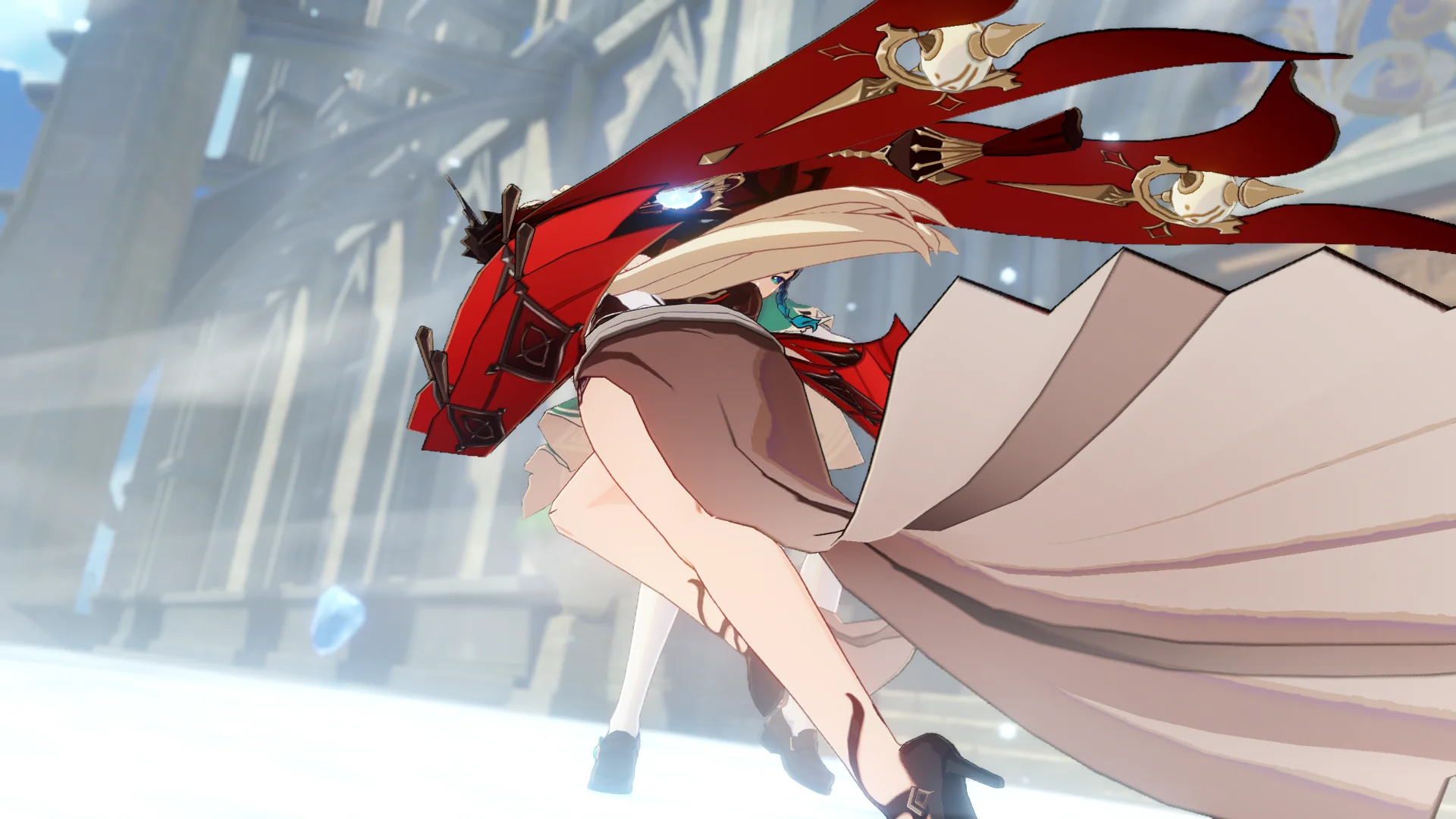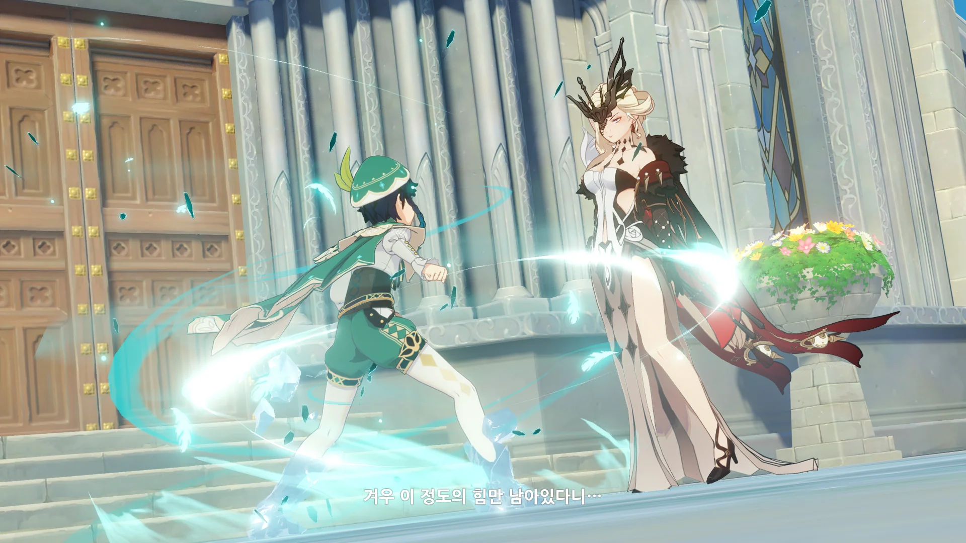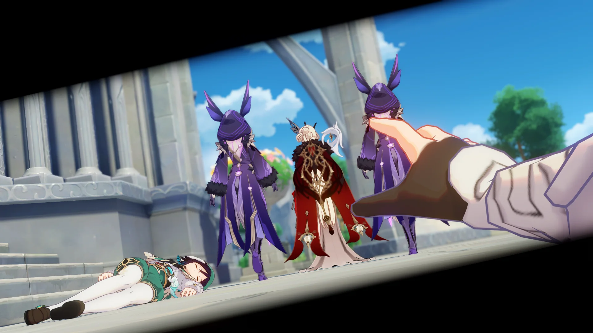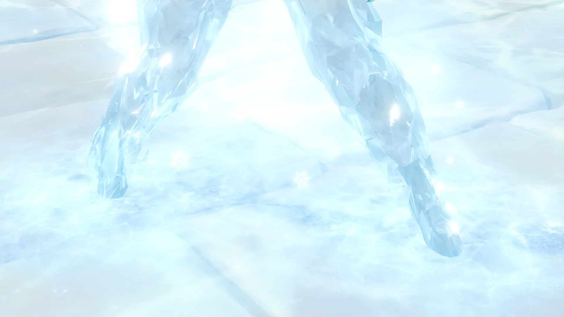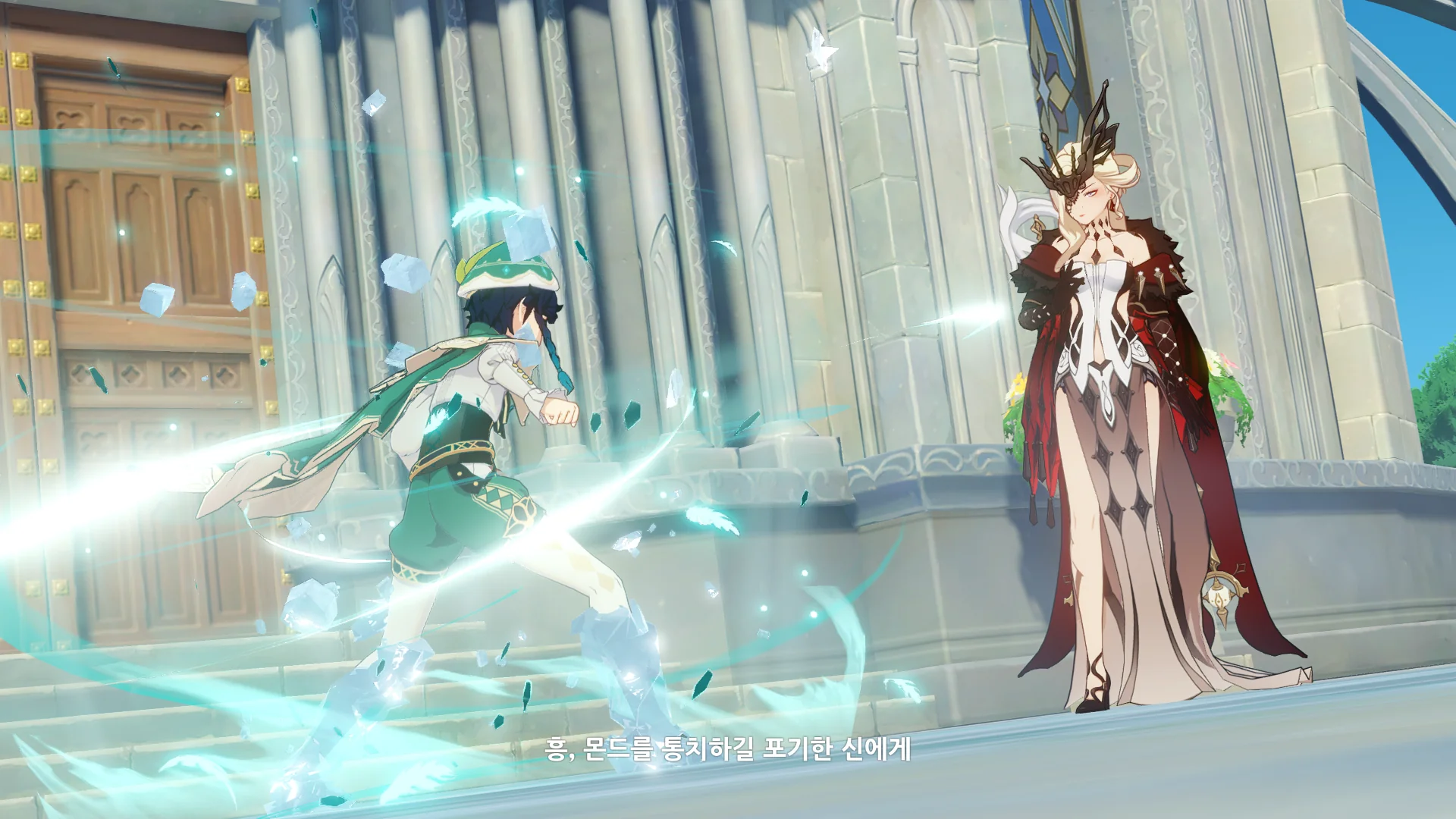 페이몬은 벌써 얼음조각이 되어 뒤로 날아갔고, 여행자가 바람을 팔을 들어서 막는 동안 우인단 채무 처리인이 뒤에서 여행자를 구속한다.