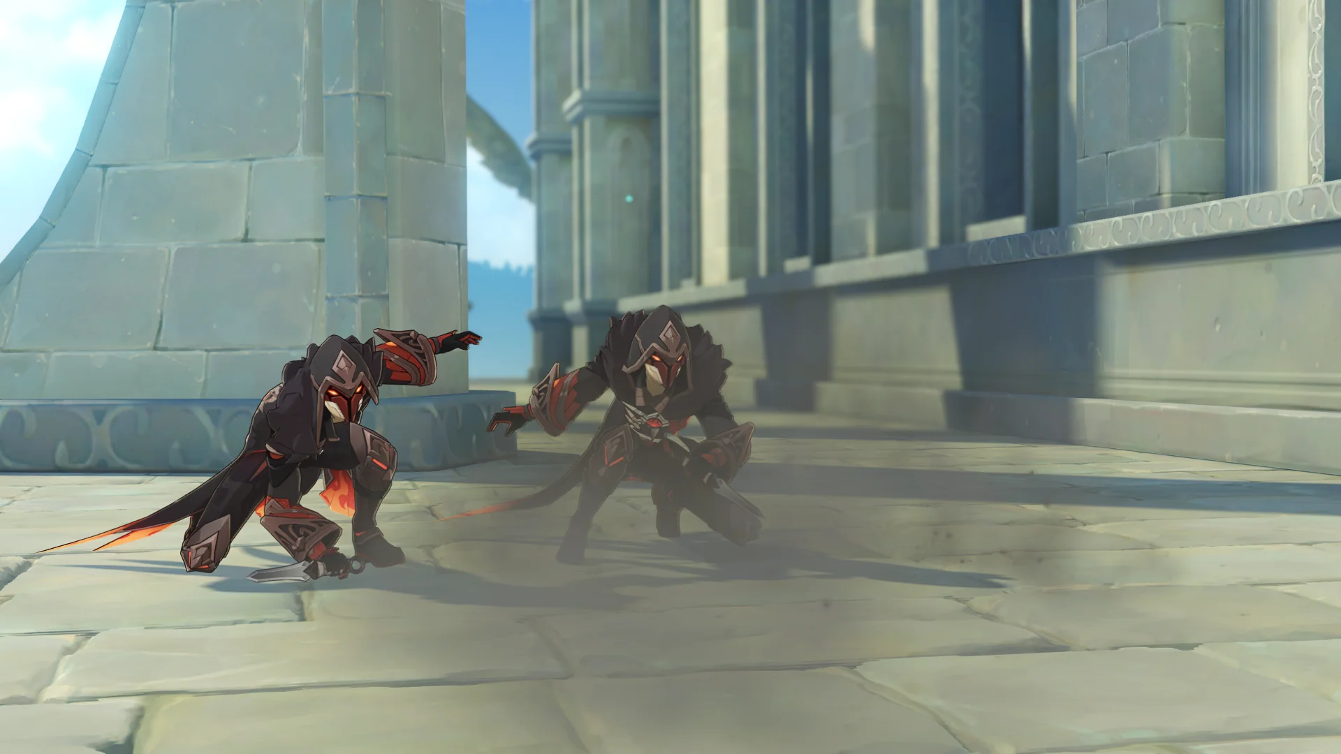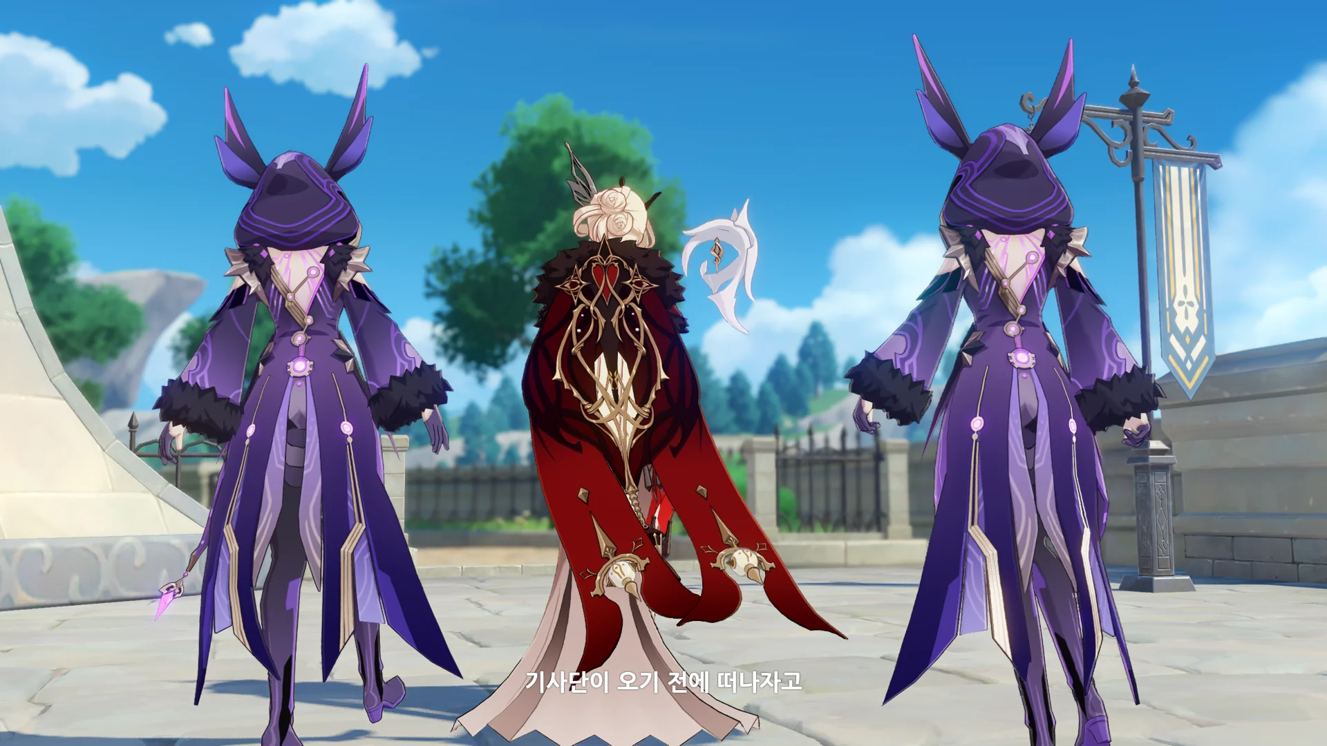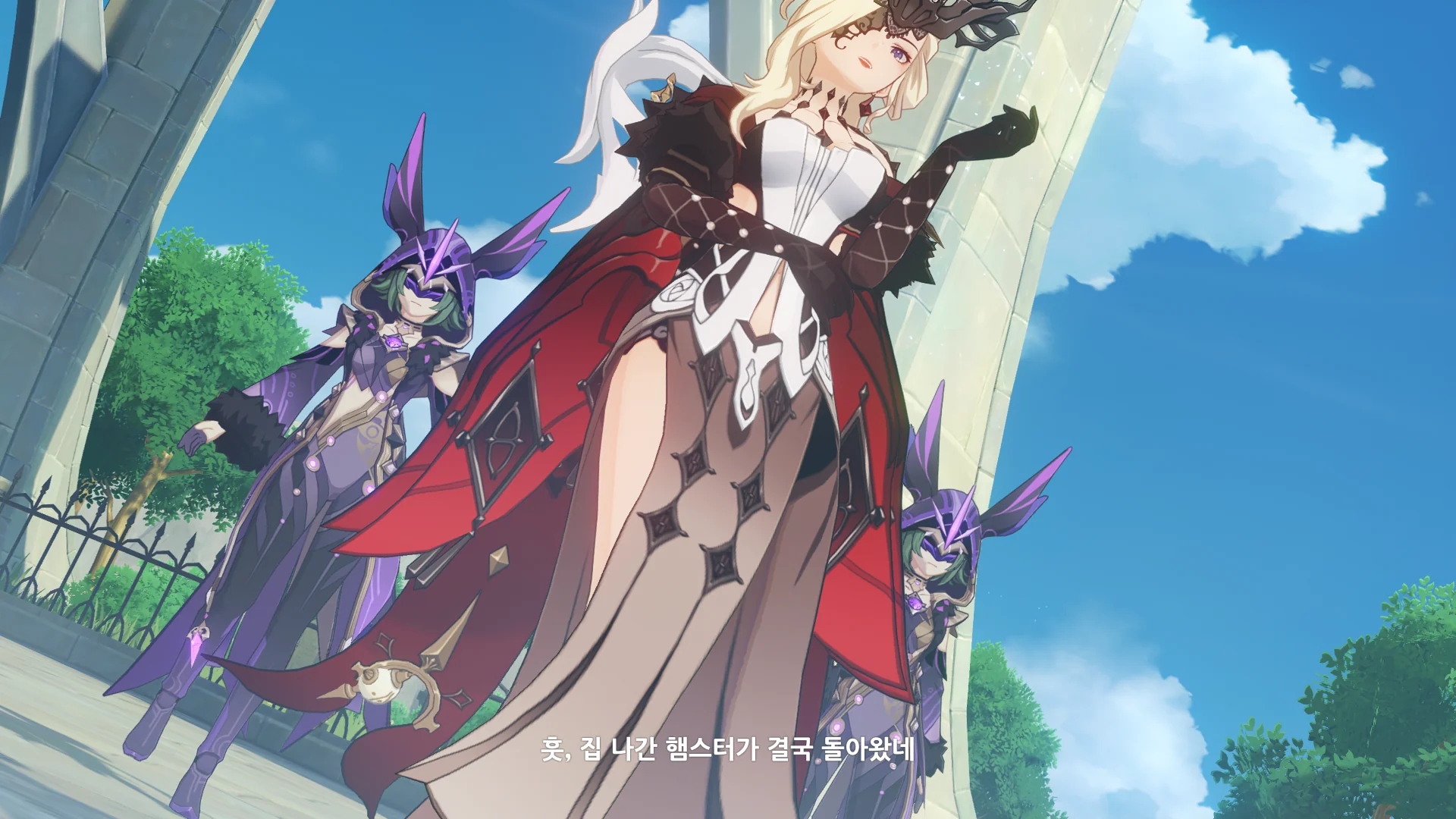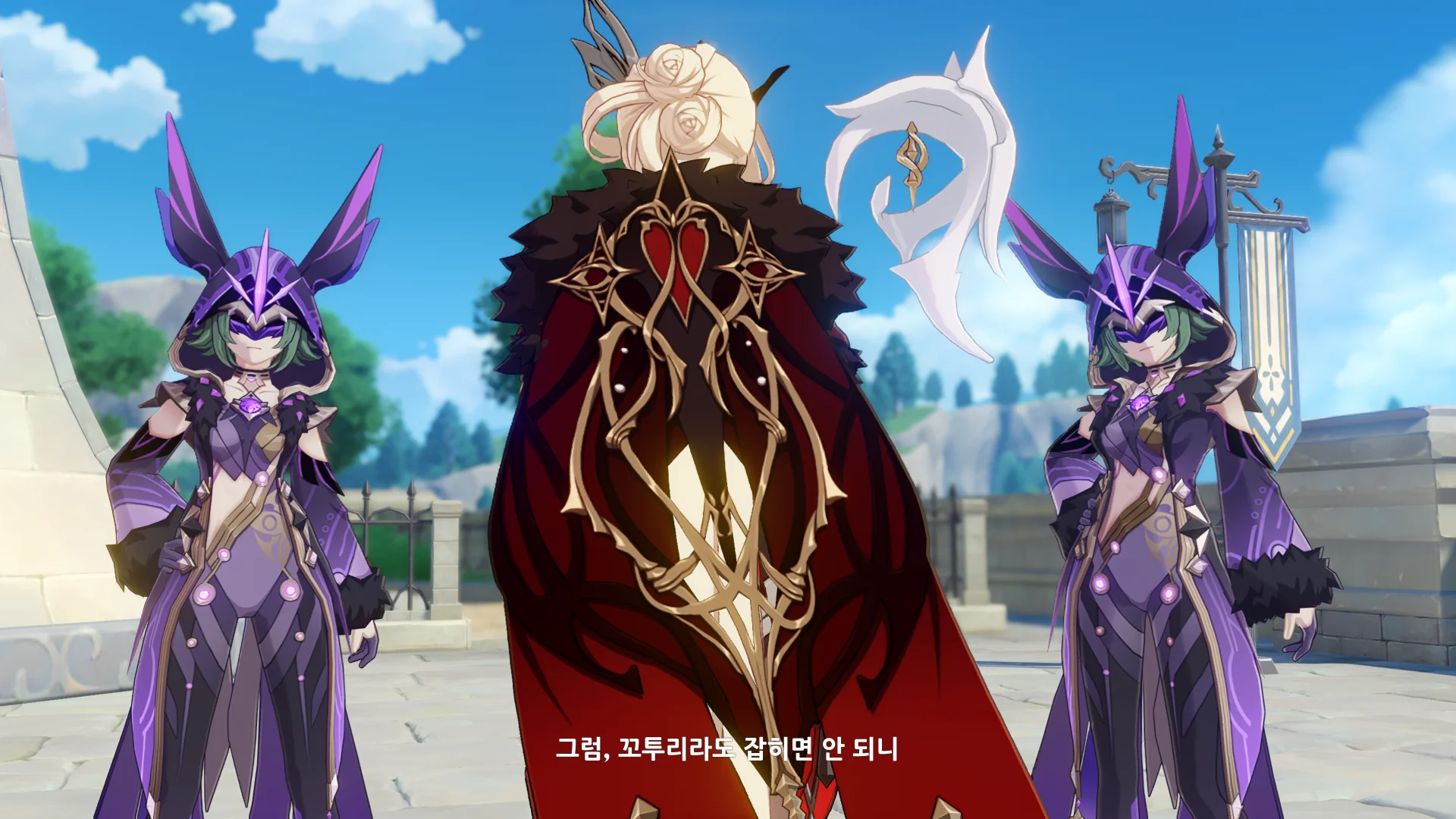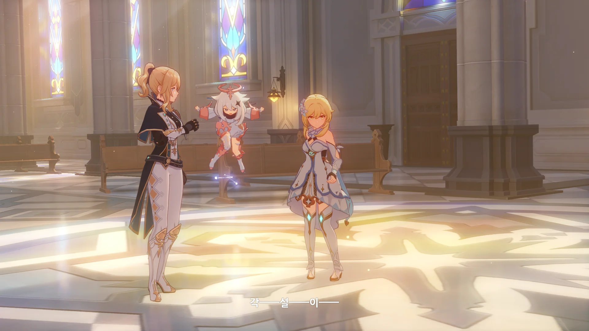 페이몬은 벌써 얼음조각이 되어 뒤로 날아갔고, 여행자가 바람을 팔을 들어서 막는 동안 우인단 채무 처리인이 뒤에서 여행자를 구속한다.