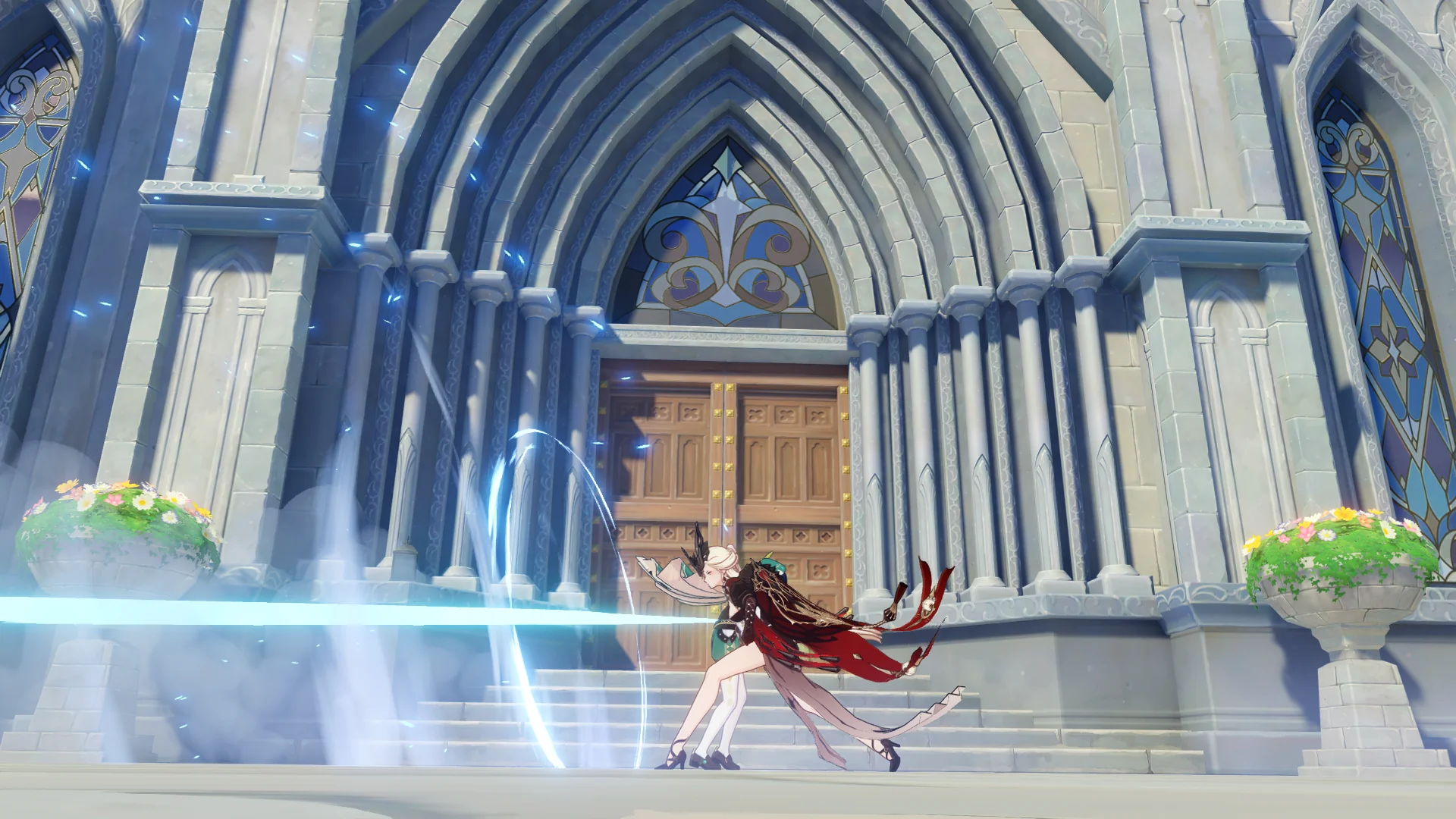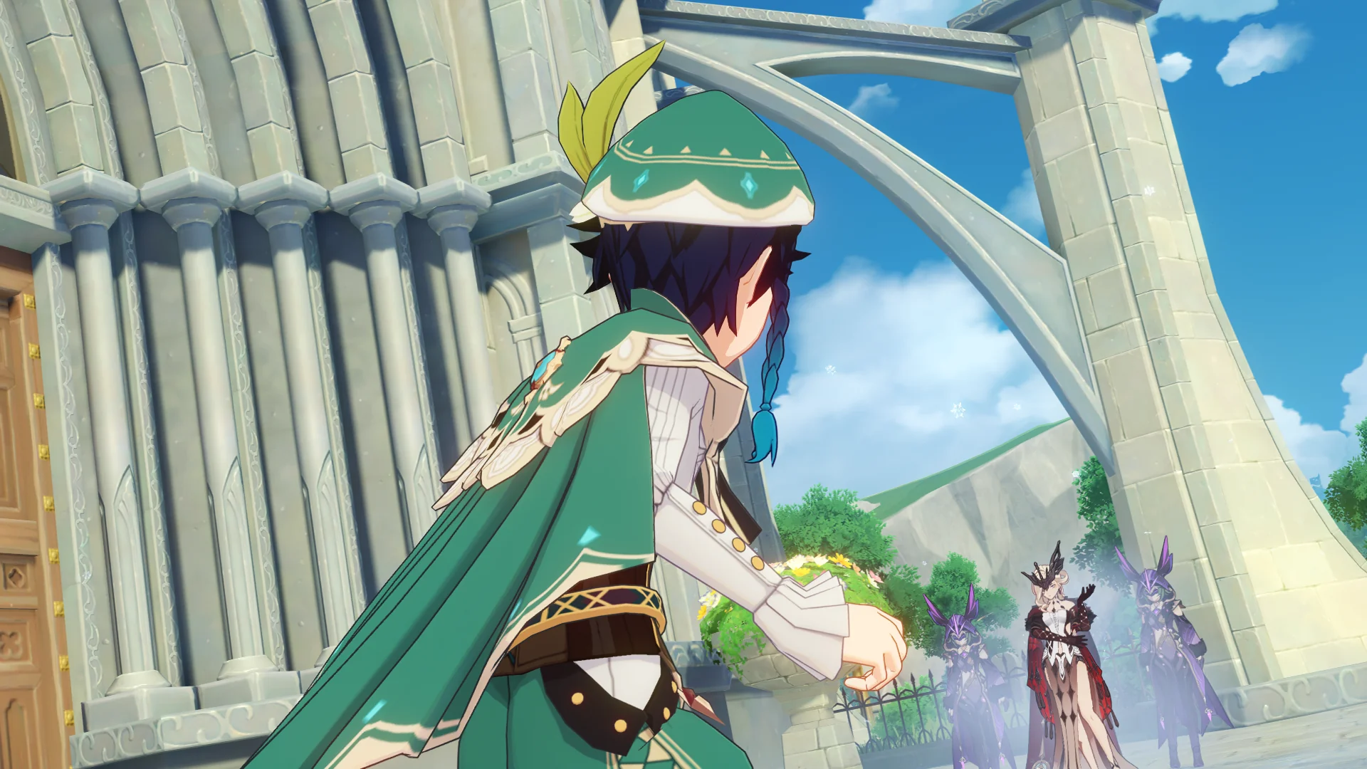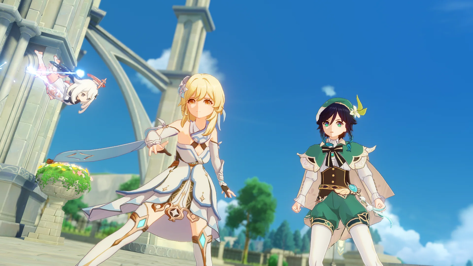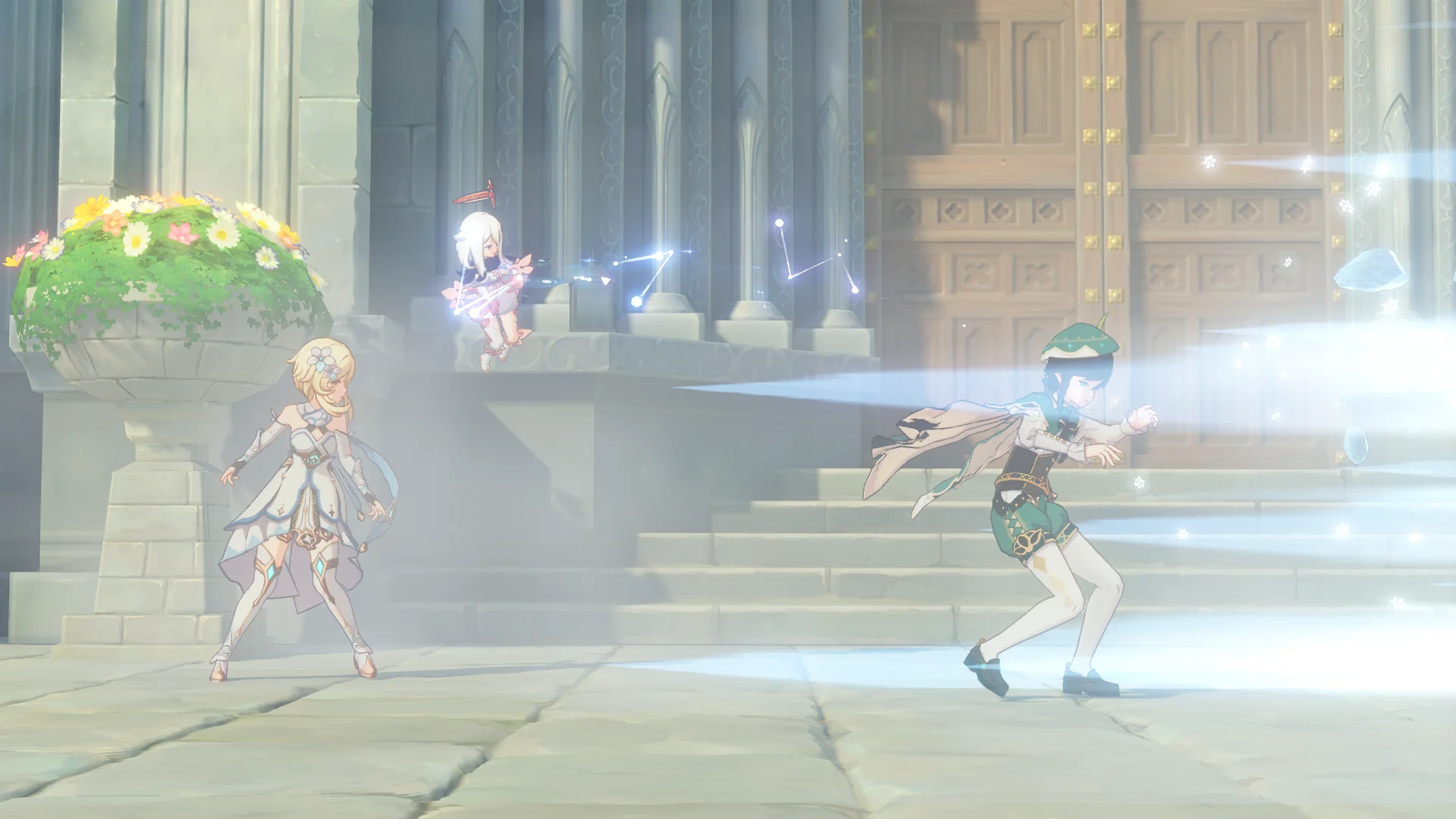 열심히 성당에서 도망치는 벤티의 뒤를 바닥에서 슬그머니 나타난 우인단 채무 처리인 두 마리가 덮치려 하자, 여행자가 바람 원소의 힘으로 이 둘을 방해한다.