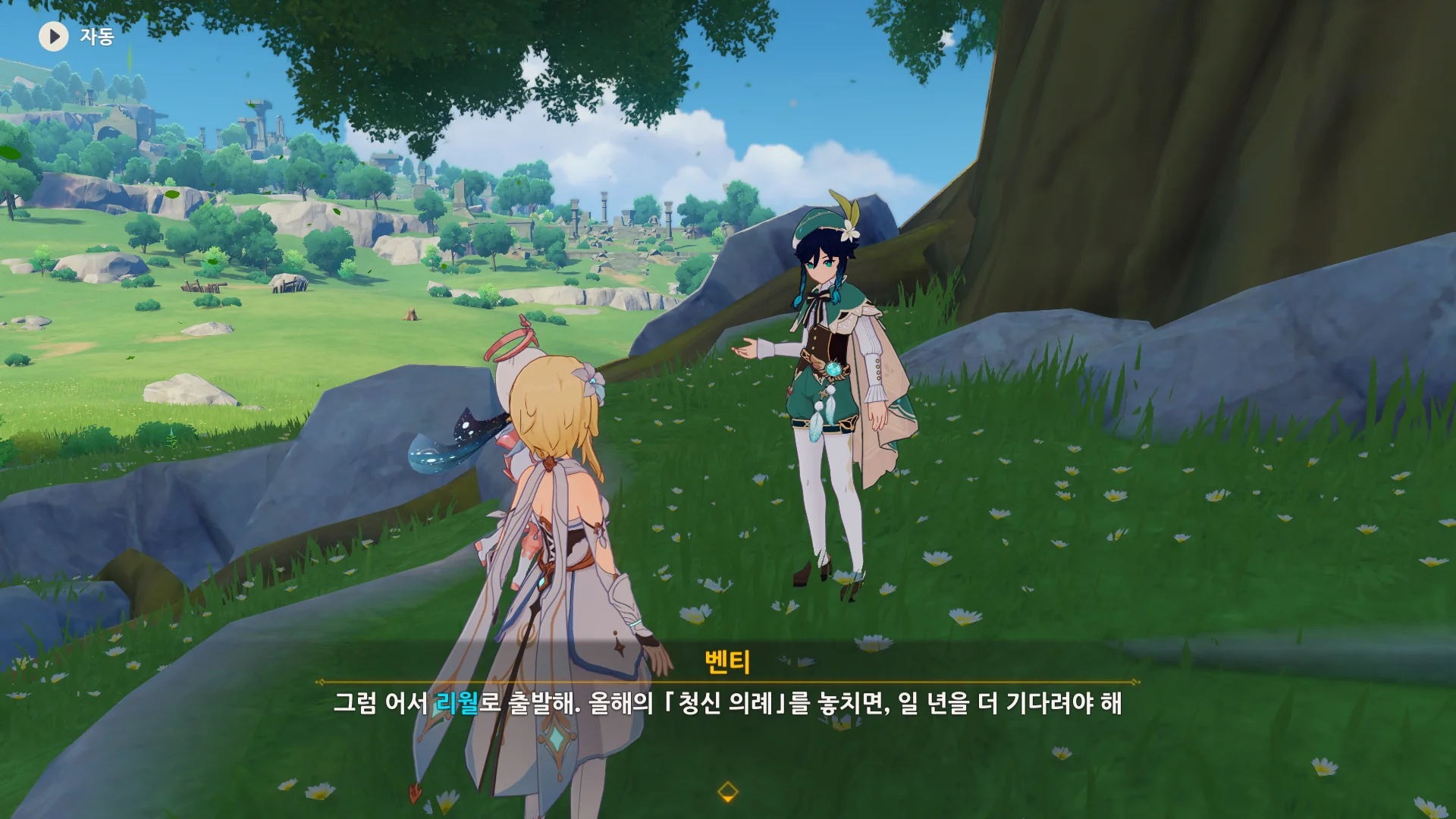 아까 말했던, 바위의 신이 공식적으로 세상에 내려오는 「청신 의례」가 얼마 남지 않았다며, 여행자가 리월로 가기를 재촉하는 벤티.