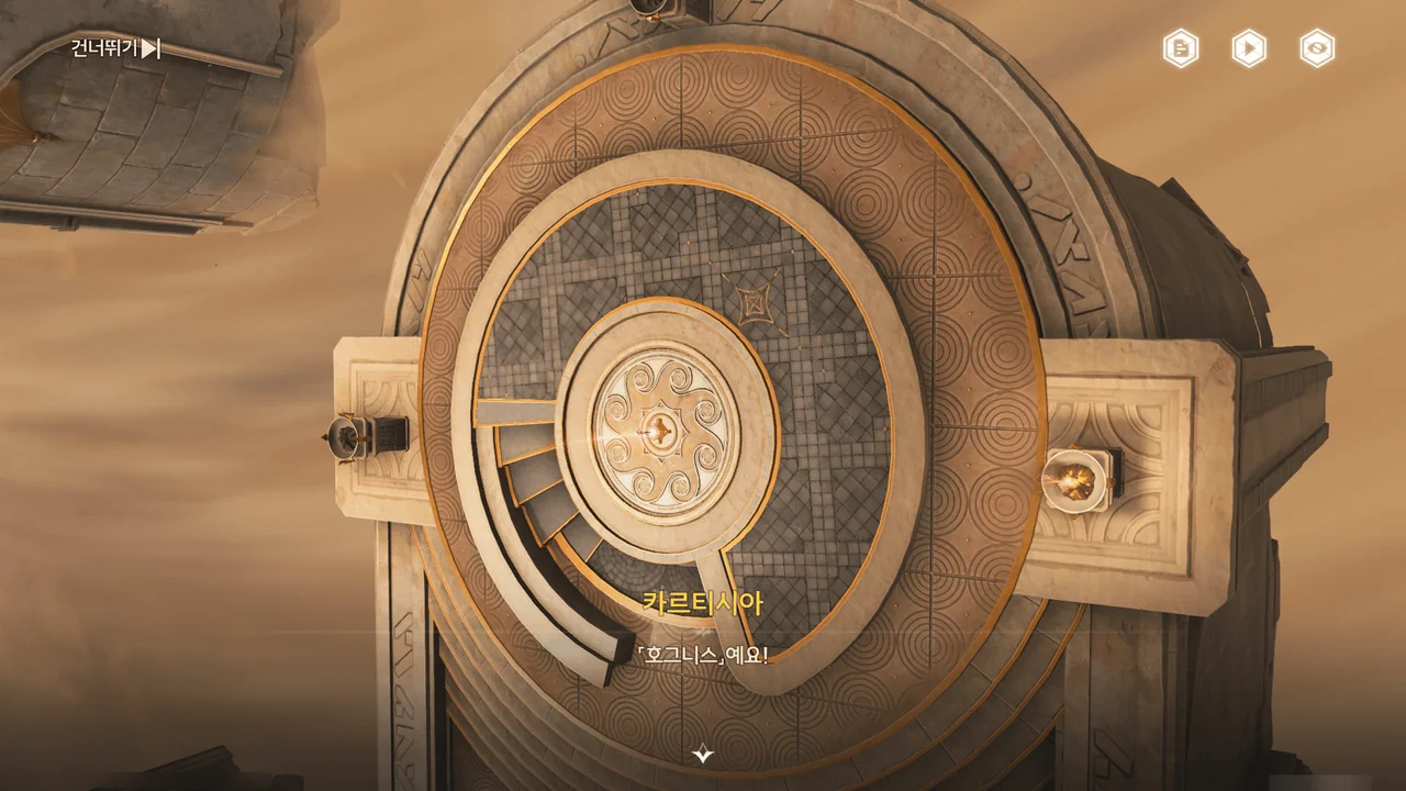 대체 무슨 원리인지는 잘 모르겠지만, 거대한 조각상 앞에 놓인 발판을 힘껏 짓누르면 그와 연결된 구조물이 그에 맞게 이동하며 서로 연결된다.